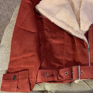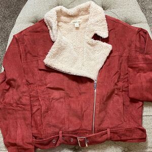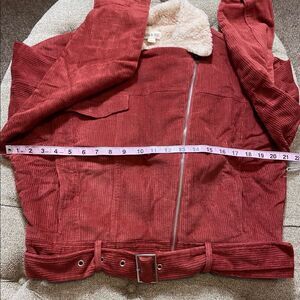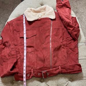 Corduroy Moto Jacket. Features faux Sherpa lining and zipper closure. Cropped length with belt. Pics with measuring tape are size M.