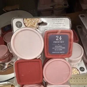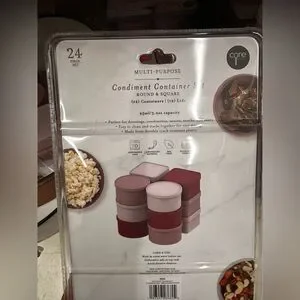 Set of 24 round and square condiment containers. Includes 12 containers and 12 lids. Colors: red, pink, and white. Durable and crack-resistant plastic.
