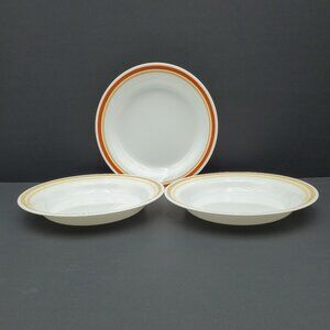 Corelle Individual Pasta Bowls Rim Soup Bowls Bundle. Set of 3 includes (2) Almond and (1) Cinnamon Chestnut. Both discontinued patterns feature double bands on white. Excellent pre-owned condition. 8.5" x 1.25".