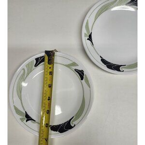 Set of 2 Corelle Black Orchid 6.75" bread and butter / side plates by Corning. Very good condition with minimal utensil marks, print is shiny and intact, no chips. Black and green abstract floral pattern along the rim.
