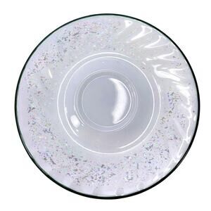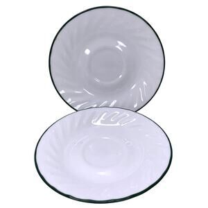 This is a set of 2 Corelle CALLAWAY Swirl design saucers. This pattern was active from 1995-2019. The 6" saucer features a white swirl rim edged in green. Microwaveable and made in the USA.