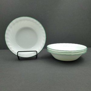 Corelle "Callaway" Soup, Cereal Bowls - Set of 4. White swirl design with a dark green band - will pair nicely with different Corelle patterns. These bowls measure 7-1/8" across and 1.75" deep. They are in very good pre-owned condition. The white is bright and clean, there are a few very minor specks of color loss on the band of one bowl and some marks on the bottom rims.