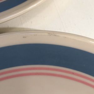 Corelle Colonial Blue Bread Plates Set of 4. 6 3/4” size- cream blue & mauve pink. Discontinued pattern/ Vintage Excellent used condition very minimal wear (one plate has tiny wear hardly noticeable-see last pics) Smooth finish Excellent shine Vivid colors pattern intact. No chips or cracks. All stamped Corelle. Minimal space when stacking Excellent addition to any cream blue or pink dish set or Corelle of same pattern.
