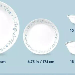 This set of six Corelle appetizer/salad/dessert plates features the charming Country Cottage pattern with white backgrounds adorned by blue and green floral accents. Each plate measures 6.75 inches in diameter and is made of durable, break-resistant glass that is both microwave and dishwasher safe. These plates are perfect for all occasions and can be used for gardening, flowers, and other themes. The brand is Corelle, by Corning, and the plates have a glossy finish. Great used condition. These plates are chip, break, and stain resistance.