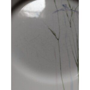 Vintage Corelle dinner plate featuring a delicate iris floral design with green trim. Durable and lightweight, suitable for everyday use or collection.