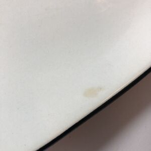Pre owned used. No chips or cracks. One area of discoloration, see picture. Minor utensil wear. The white is not a perfect white, but a bit more ivory or cream. See pictures for all conditions.