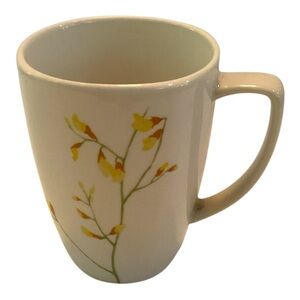 Corelle Kobe porcelain mug, featuring a distinctive rounded square shape and a design with yellow floral stems.