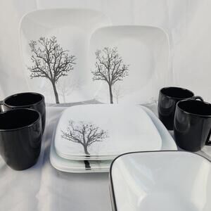 ♻️ Corelle Square Timber Shadow Dinnerware 16-Pc With Black Mugs