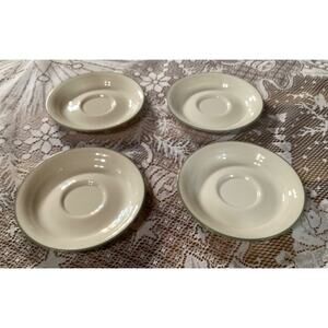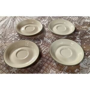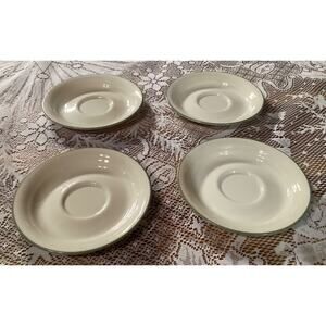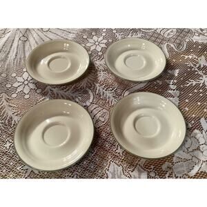 The Corelle Thymeless Herbs 6 1/4" Saucer Dessert Plates Set of 4 is a vintage, four-piece set of round dessert plates featuring a sandstone color with green trim. Made of Vitrelle glass, these stackable, dishwasher-safe plates are decorated with an herb theme and have a glossy finish. Manufactured in the United States during the 2000s, this original Corelle product is perfect for all occasions and is break-resistant for durability. Ideal for teens and adults, this set adds a touch of decorative charm to any dining table.