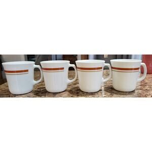 Add a touch of mid-century modern charm to your kitchen with this set of four Corelle by Corning mugs in the Cinnamon pattern. Made of pressed glass, these round mugs feature a glossy finish in a red and beige color scheme, with a subtle striped design that adds a touch of vintage flair. Perfect for all occasions, these mugs are sure to become a beloved part of your collection.