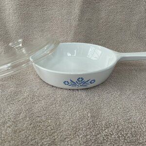 This cute little Corelle fry pan has a glass cover. It has a 7 inch diameter- perfect for a couple of eggs or a single serving of just about anything!