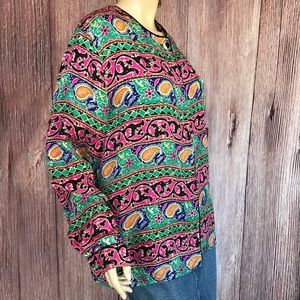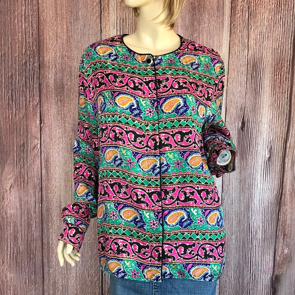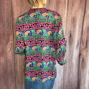Colorful silk top with paisley design, button up, long sleeve, size 12. Good condition, no visible holes or stains. See measurements.
