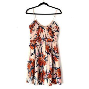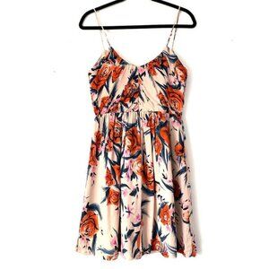 Beige dress which combines a bold, oversized floral print of red, navy, pink, and violet