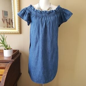 This Corey Lynn Calter Chambray Dress from Anthropologie features light weight dark wash denim, an off the shoulder silhouette with ruffle detailing and side seam pockets. Perfect Spring and Summer dress! 100% cotton