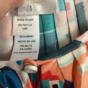 Stand out with this vibrant geometric print top. Perfect for adding a splash of color to your wardrobe. Length is 24” and pit to pit is about the same. Keyhole button front. Gorgeous spring and summer top!