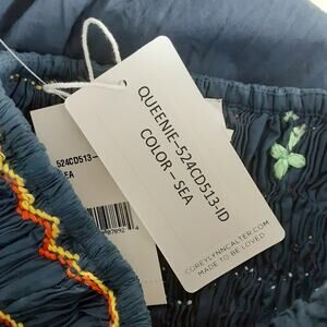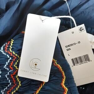 Corey Lynn Calter Queenie Dress Smocked Sleeveless Midi Dress Blue Embroidered L
