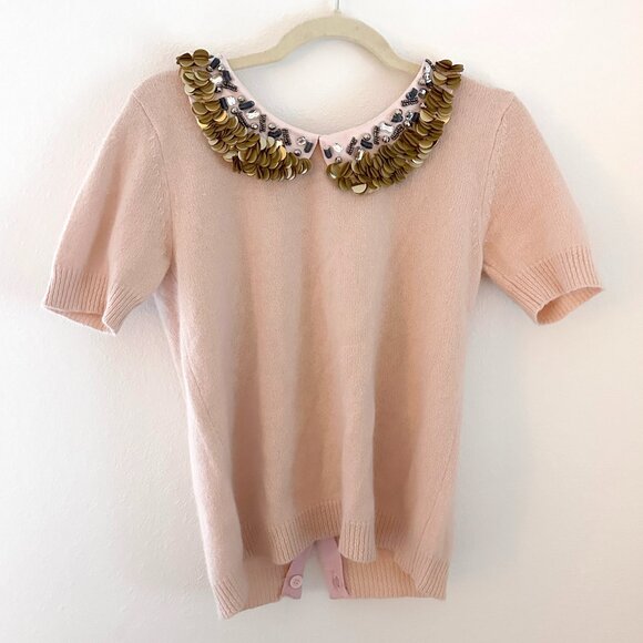 blush pink angora sweater with gorgeous sequined peter pan collar. buttons down the back. size S. chic. unique.