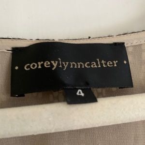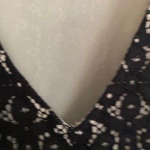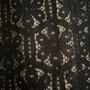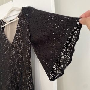 Black lace mini dress, cream gauze lining, bell sleeves, deep v-neck