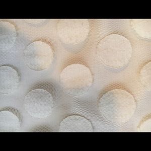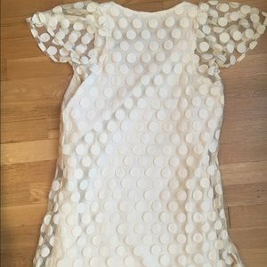Beautiful and fun dress with polka dot overlay. Under layer of dress is cream color cotton. Dress hits above the knee and is flowy, flirty, and fun!