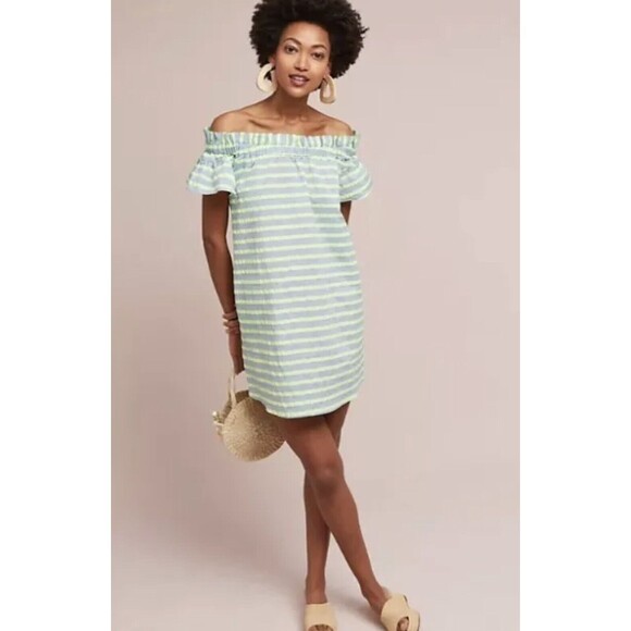CoreyLynnCalter Bayside Green Blue Striped Off Shoulder Flutter Dress Womens M