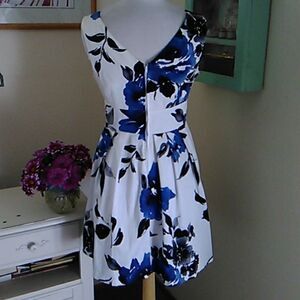Cotton blend pleated wrap dress. Beautiful floral dress in deep blues. Wider waistband. Soft pleats. Front pockets. Top lined. Bra friendly straps. Back zip. Size 10 measures 38 at chest, 31 at waist. Belt loops here, sorry no belt. 48 at hips, pockets here. 36 long from shoulder to hem. Lovely graphics.
