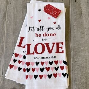 NWT set of 2 matching red pink and white valentine kitchen dish towels with 1 Corinthians 16:14 Bible verse.
