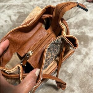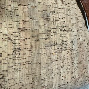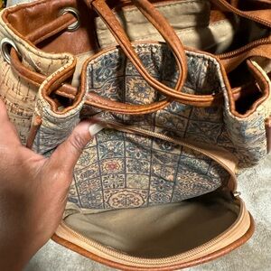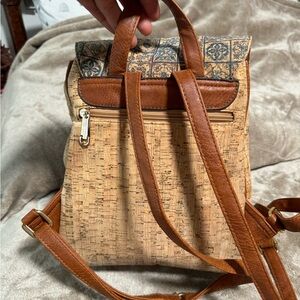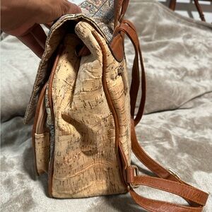 Gentle used Cork backpack with a tile pattern, zipper and lock, back pocket and synthetic leather handle and straps.