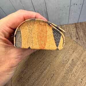 This is a cork sunglasses case which is a nice sustainable fashion choice. It has fish on the outside of it.