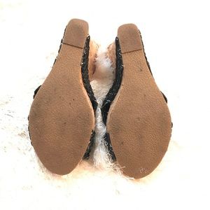 Cork wedge sandals feature thick black straps with silvery thread woven through. Wedge measures 4.5". Fits sizes 6.5/7. Minimal wear, only worn a couple times.