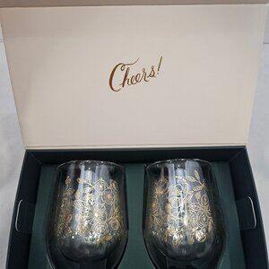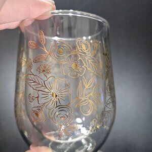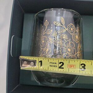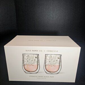 These Corkcicle Stemless set two glasses by Rifle Paper company are perfect for wine lovers, gifting or everyday use. They are insulated double walled glass with an elegant signature gold floral design. The sides are flat for easy grip. These mugs combine elegant design with functional insulation, making them a delightful choice for enjoying drinks. They are also presented in a pretty gift ready box with gold foil and magnetic closure. Imported. Hold 12 ounces. 4.5 inches tall. Keeps drinks both hot and cold. Non smoking pet free home.
