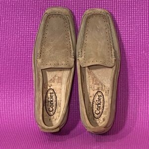 Corkies Women's Tan Suede Leather w/Cork Insoles Slip On Loafer Shoes. Color: Tan. Gently used with upper body of shoes and treads in excellent condition – refer to pictures. No rips or tears. Smoke free. There is no size listed in these shoes but mirror same size to other 6.5 shoes.