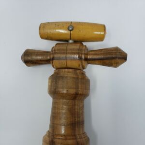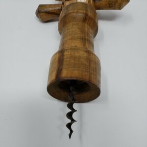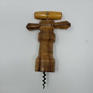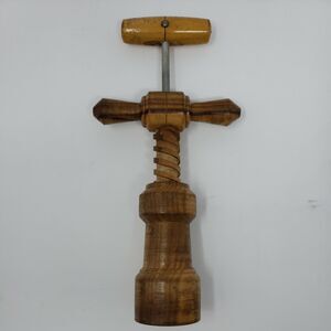 This vintage wooden corkscrew wine bottle opener is a unique addition to any barware collection. Crafted with medium brown wood and featuring a wood grain pattern, this piece is perfect for all occasions. It includes a handle for easy use and is an original piece, perfect for collectors. Pre-owned. Previously Loved. See all photos for condition and wear. Has some scratches on handle from vintage age and use. Collectible.