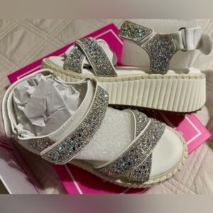 Sparkling silver straps with rhinestones. Comfortable white platform. Stylish and eye-catching.