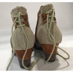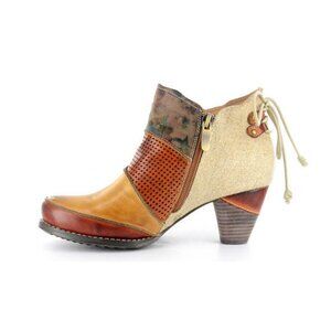 Leather upper and fabric patchwork like look with lace up back. Side zip.