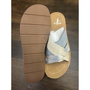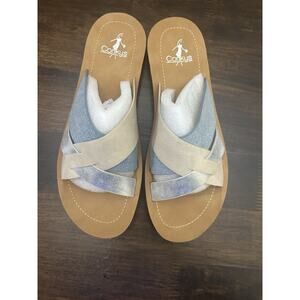 The Corkys sandals are a stylish and comfortable choice for women in size 9. With a unique crossover strap design, these sandals feature leather uppers in a multicolor finish. Perfect for casual wear, the slide style of these sandals is both fashionable and practical, making them a versatile addition to any wardrobe.