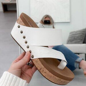 Stylish white wedge sandals. Comfortable cork sole. Perfect for casual outings. Love them just a tad too small, fit more like 8.5 Never worn. NWOT
