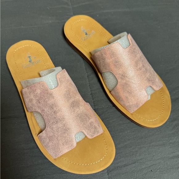 Corkys Women's Metallic Pink and Tan Slide Sandals