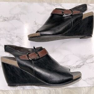 Step out in style with these chic black and brown wedge sandals. Perfect for any occasion, these shoes offer both comfort and elegance.