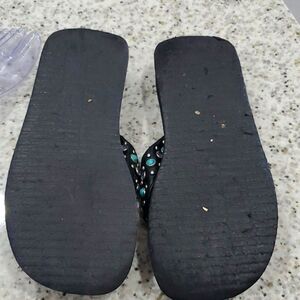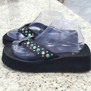 Corkys jeweled sandals, size 9, 2 inch heel, shades of silver & turquoise with cross