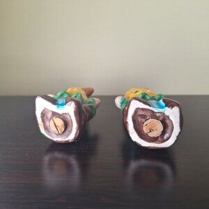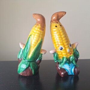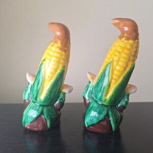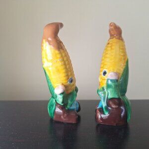 Vintage salt and pepper shakers designed as corn cobs with tuxedo suit faces. These charming decor pieces include cork stoppers for easy refilling, adding a nostalgic touch to your dining table.