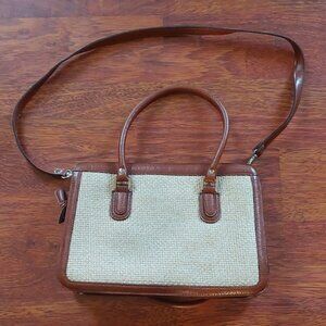 brown vegan leather trimmed woven straw finish purse. tons of compartments and pockets..there is a centre compartment, with compartments on each side, as well as a pocket on the front, and a zip-up inner side pocket on each side
