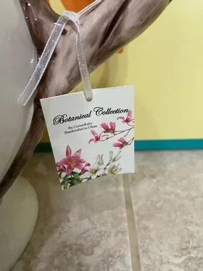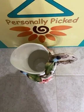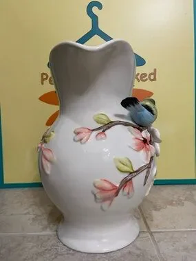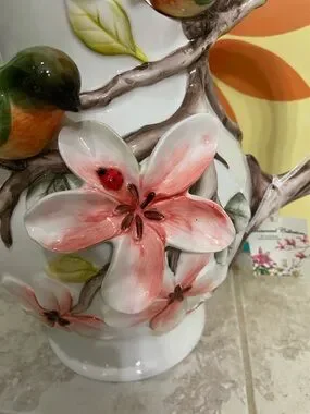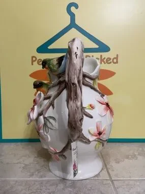 Corner Ruby Botanical Collection pitcher. Pitcher has two birds and vibrant pink flowers. Pitcher has raised flower and birds. Part of the Botanical Collection by Corner Ruby. Pitcher is very large and detailed. Brand new!