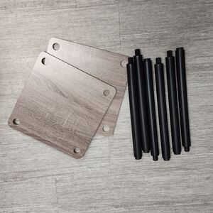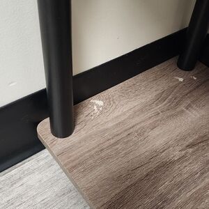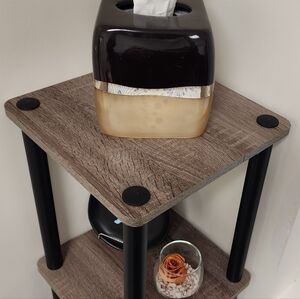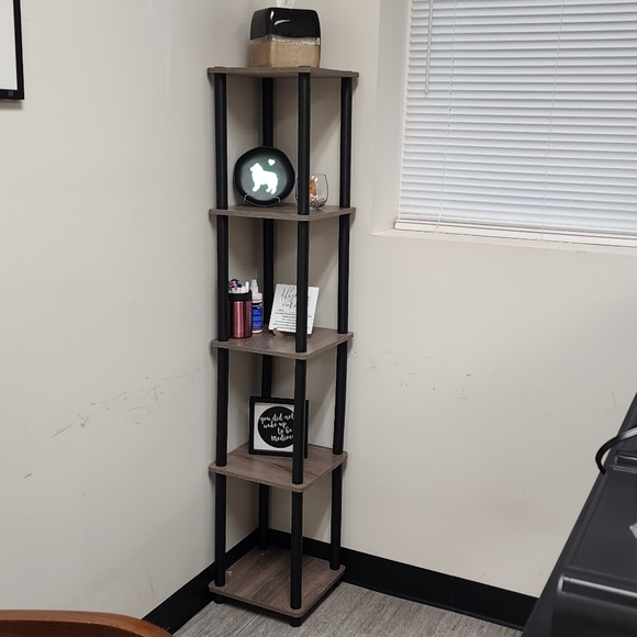 Versatile corner shelving unit in black and brown. Adds organized display space and modern style to any room. Durable design with black supports and brown wood-look shelves. Easy to style with decor and essentials.
