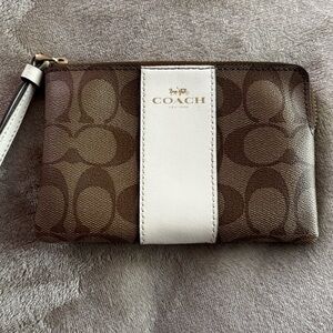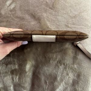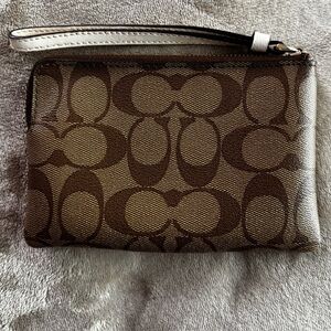 Elegant Coach wristlet in rich brown. Ideal for any outing.