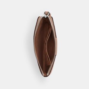 Signature coated canvas and smooth leather, Two credit card slots, Zip-top closure, Fabric lining, Wrist strap attached