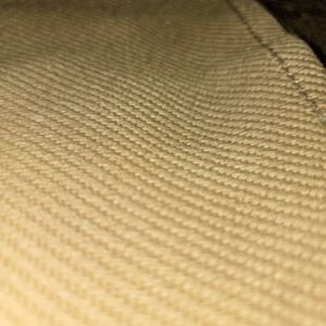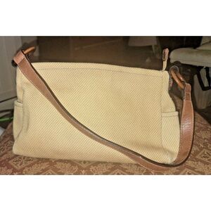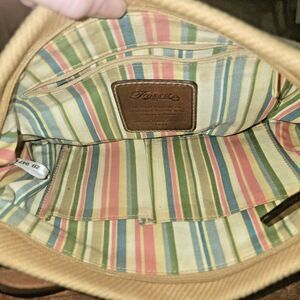 FOSSIL Muted Yellow Tweed Fashion Every Day Handbag w Leather strap & 2 side pockets w/ a warm contrasting striped fabric, a tan leather shoulder strap, natural wood rings, & a cotton liner rainbow of warm stripes inside.