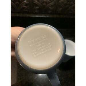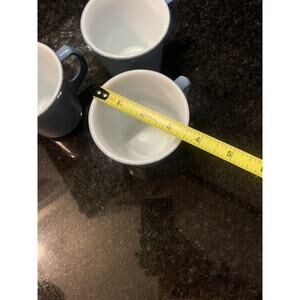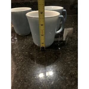 Set of 3 pyrex mugs white interior and slate blue exterior. No chips cracks or breaks. No substantial paint loss. Good condition for their age. Measuring 3.5" tall.
