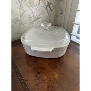 This gorgeous CorningWare casserole dish in the Shadow Iris pattern is the perfect addition to any kitchen. With a 2 liter capacity, it's great for making your favorite casseroles and baked dishes. The dish is made of durable glass and ceramic materials, with a glossy finish and beautiful floral pattern that's sure to impress your dinner guests.