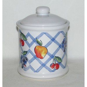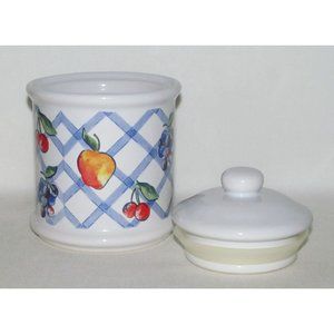 This is a very nice multicolor small flat canister with lid in the Fruit Too pattern, Corelle. It was made by the Corning Glass Co. It measures 3 3/4 inches tall and 3 3/4 inches across the top.