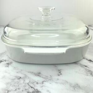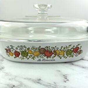This Vintage Corning Ware bakeware is from the Le Romarin "Spice of Life" collection. The A-10-B casserole dish is 9 3/4" x 9 3/4" x 2" and has a glass lid.